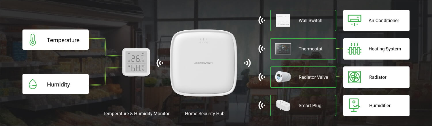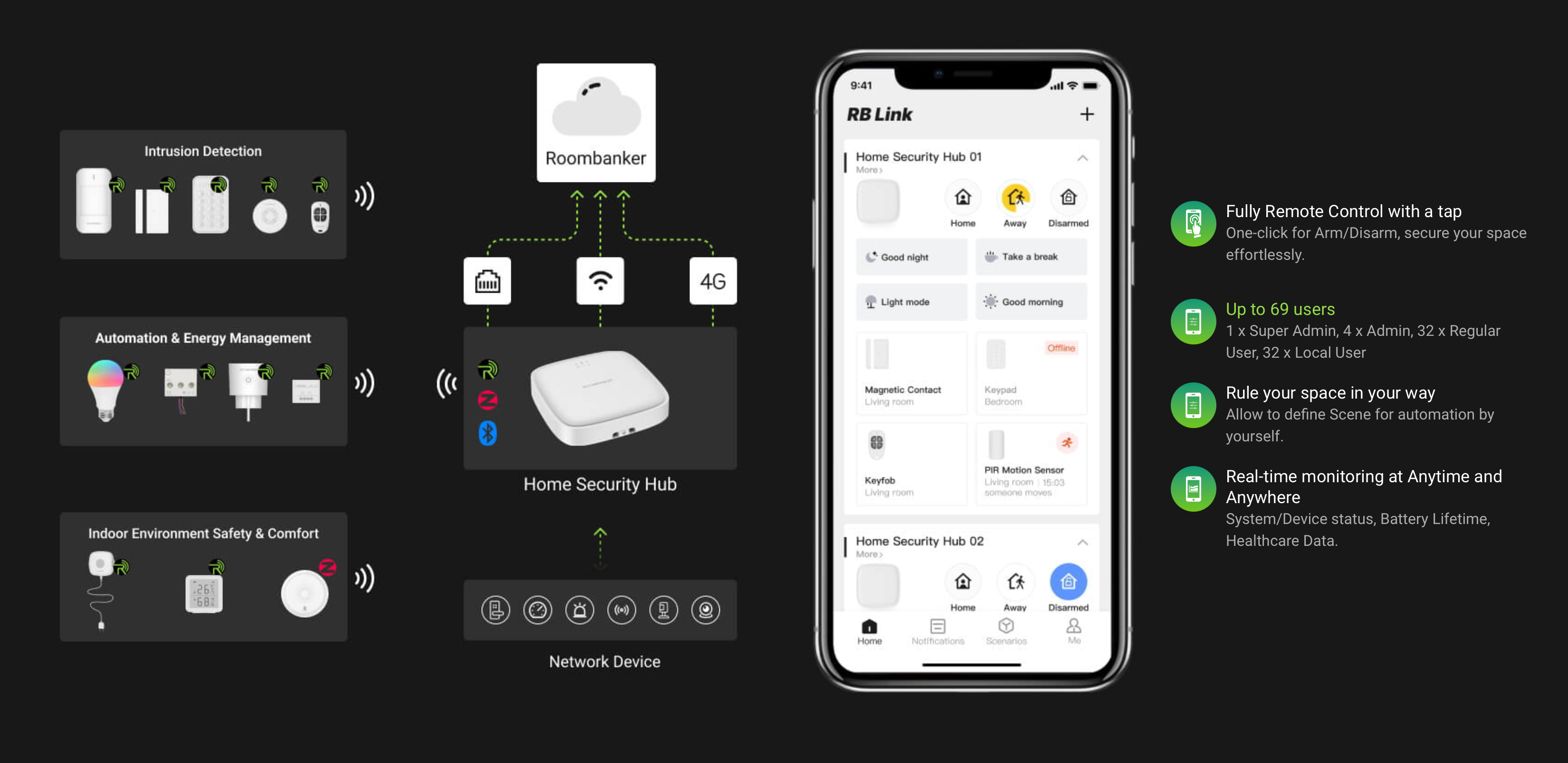 Our Shop & Store Solution mainly use RFB, Zigbee and BLE technology to collect data from intrusion detection system, indoor automation system, and energy management system, etc., and upload the info via aHome Security Hubto the Roombanker. Users can view status update and remotely operate via ourRB-Link app. The entire system topology aims to brings convenience and efficiency to your fingertips.
