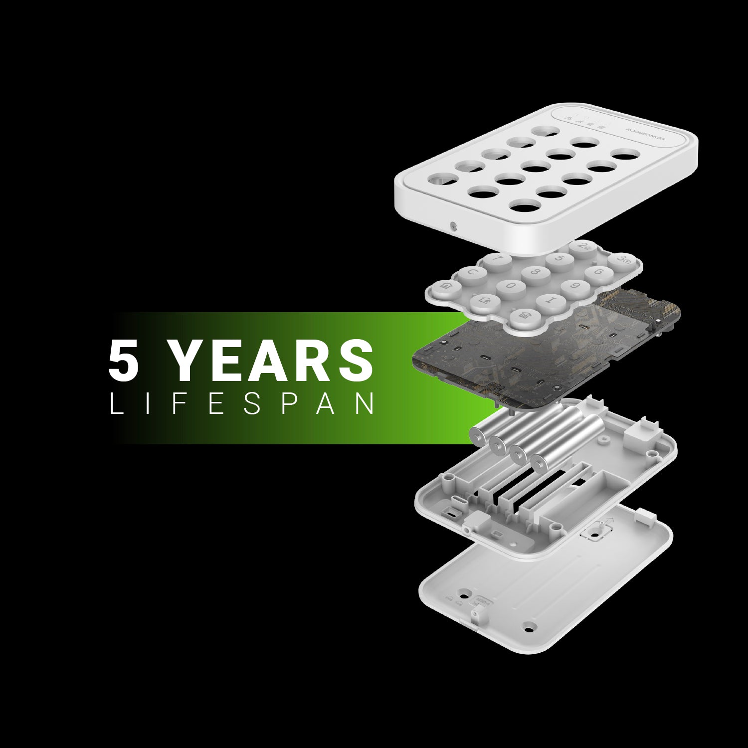 The alarm keypad operates efficiently withfour AAA batteriesand is incorporated an optimized battery lifespan feature. If there is no operation for 10 seconds, all lights will automatically turn off. With an average usage of arming and disarming once a day, the alarm keypad can provide continuous functionality forup to five yearswithout the need to replace the battery.