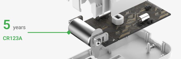 The PIR sensor is powered by a standard CR123A lithium battery, providing up to five years of worry-free use and easy replacement.