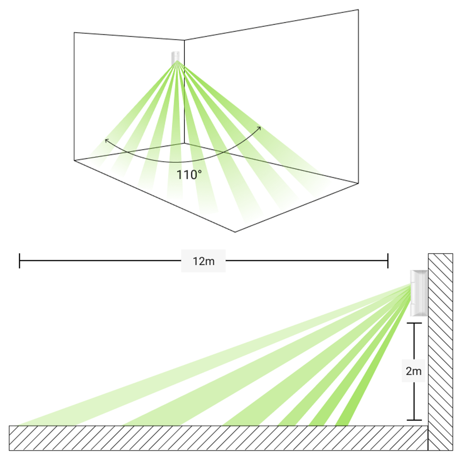 The PIR sensor offers extensive detection coverage. With a detection range of up to 12m and a wide detection angle of up to 110°, it can be installed on ceilings or walls to sensitively detect movements within the room.
