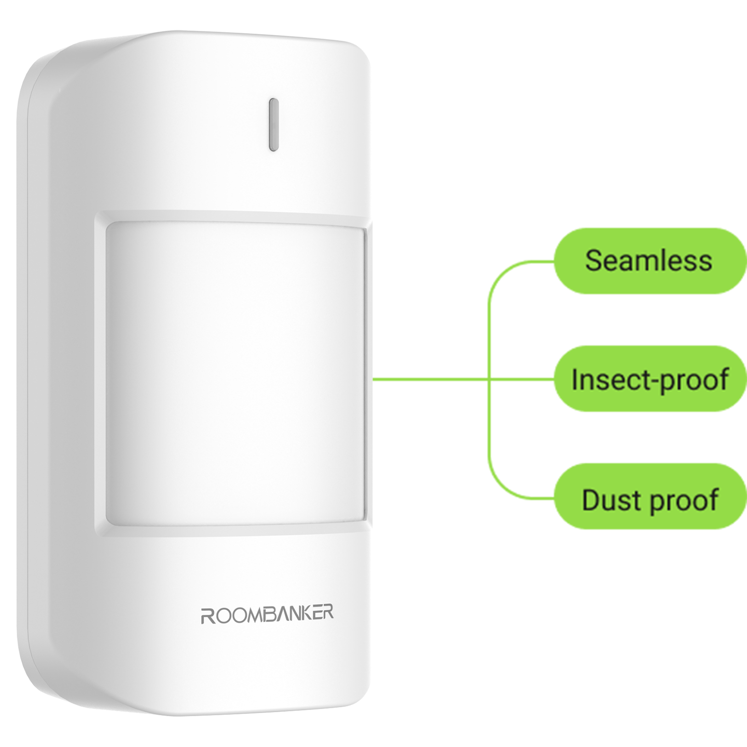 Motion sensors using PIR motion-detecting technology can monitor heat changes in a designated area. This allows Roombanker's pet-immune PIR senosr to movements from animals weighing less than 10 kg, so they won't be affected by a single large dog or even a few tiny cats.