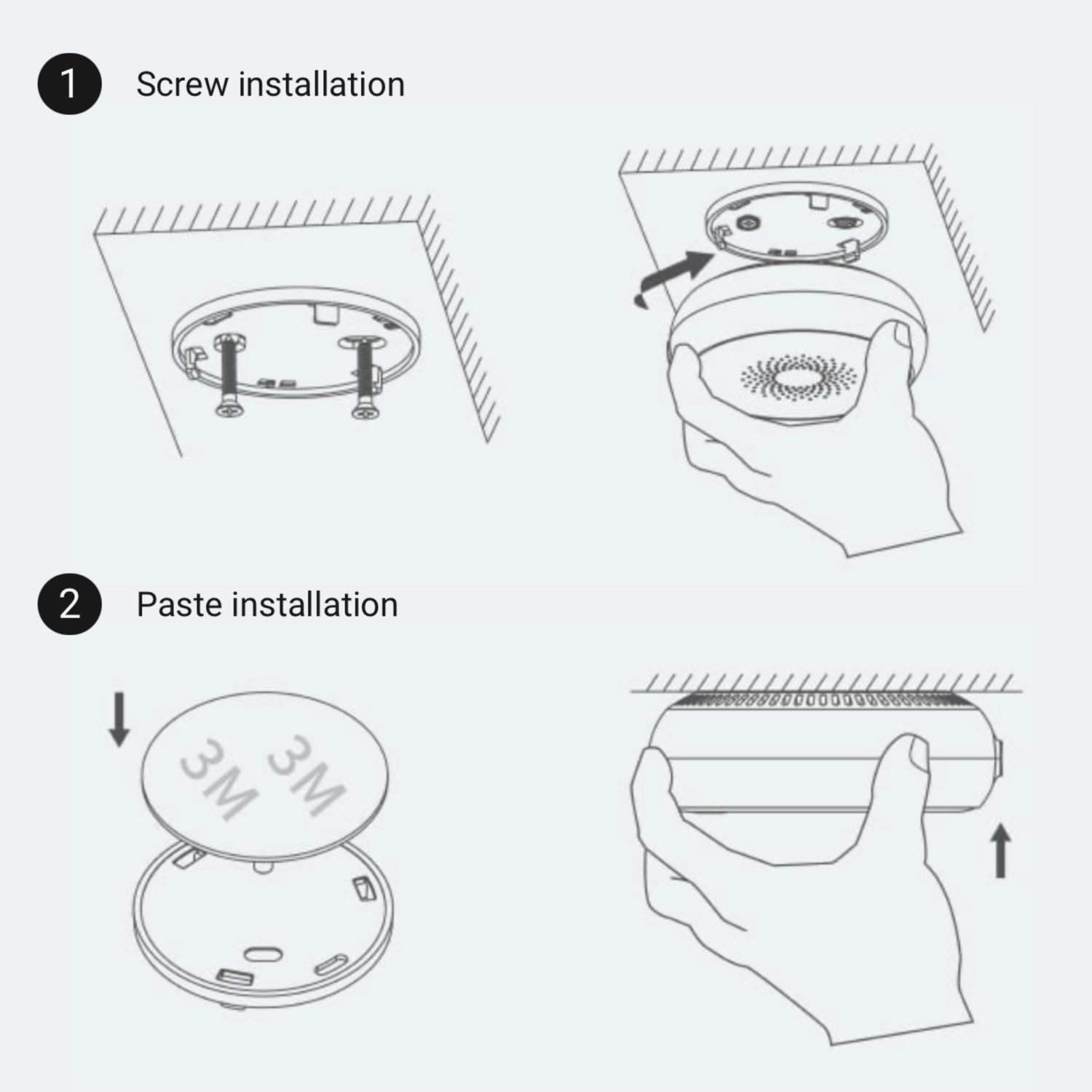 The smoke detector supports both adhesive and screw installation, allowing you to choose based on your preference. To ensure optimal detection results, we recommend installing the detector horizontally in the middle of the ceiling. This positioning maximizes its detecting effectiveness and ensures the best possible safety coverage for your space.