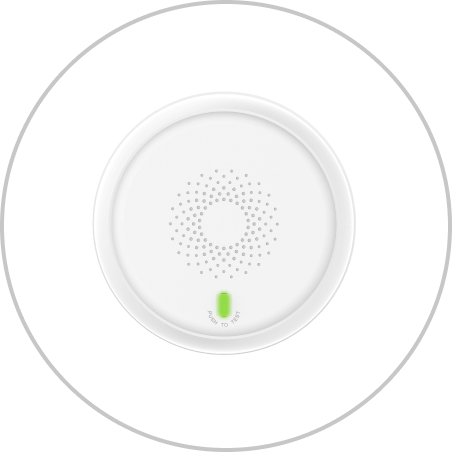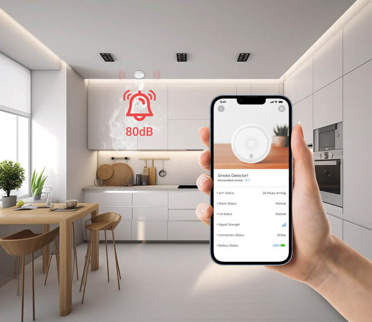 The smoke detector features an independent working method, which triggers an immediate alarm when the smoke concentration surpasses the preset threshold. The built-in buzzer emits a loud 80dB alarm sound and the red indicator flashes rapidly. This alarm information is also transmitted to the Home Security Hub for further action.