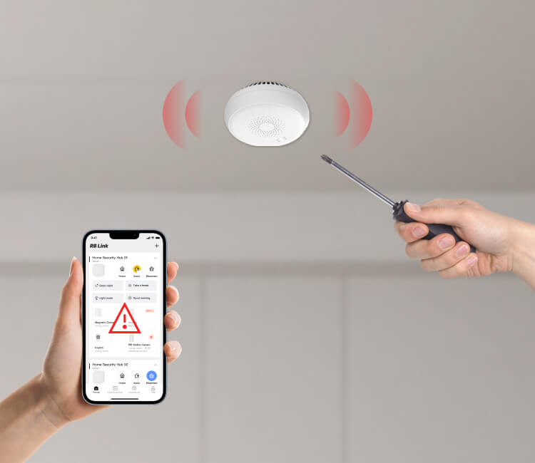 The smoke detector has tampering protection alarm mechanism. In the event of loose installation or deliberate vandalism, the tampering alarm is promptly triggered, and the information is instantly pushed to the mobile app.